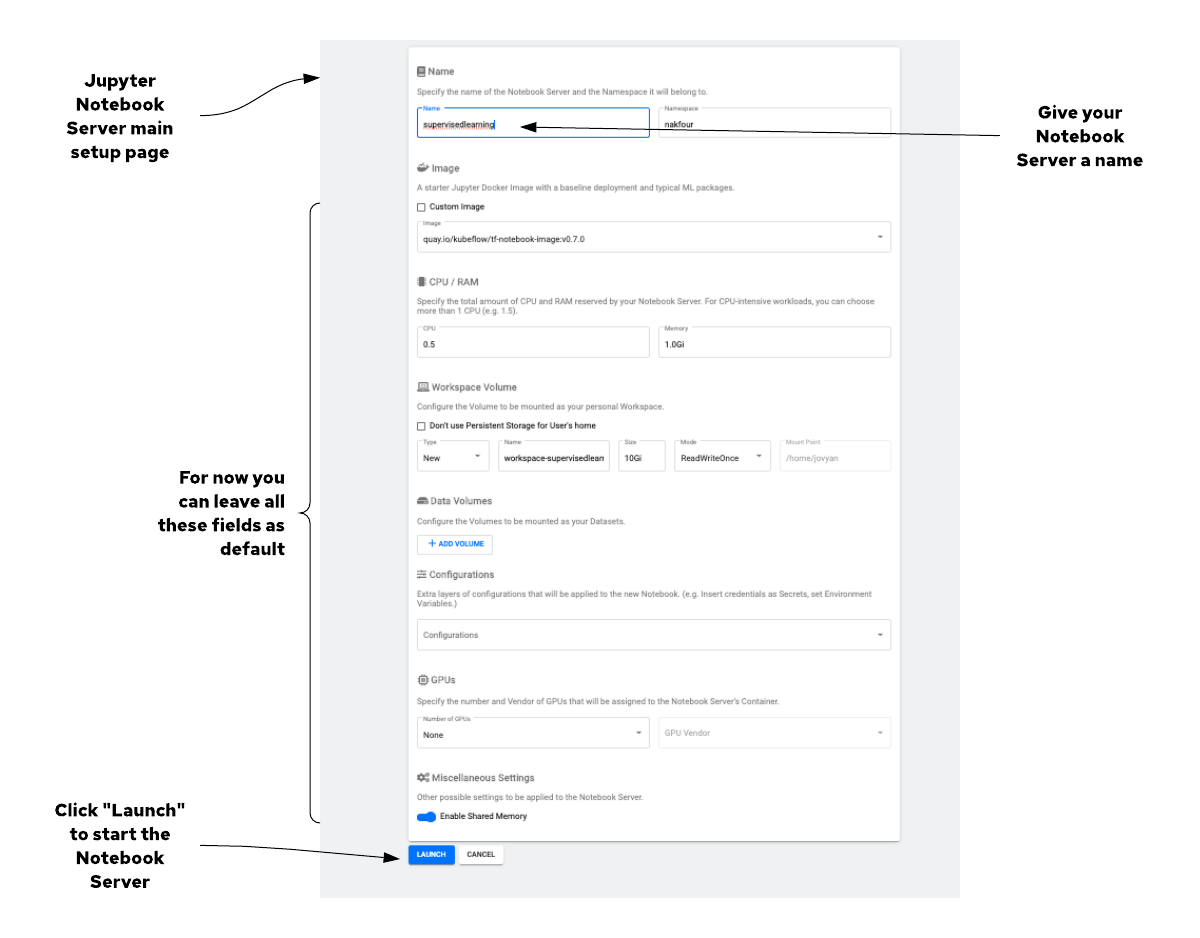 Name 부분에 Jupyter server 이름을 명시해 준 후 Launch를 클릭하면 Jupyter 서버가 구동이 된다.