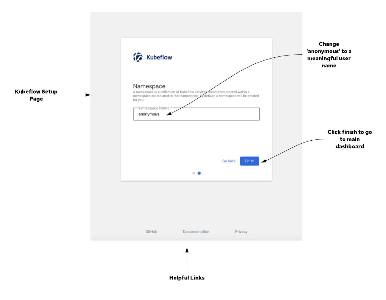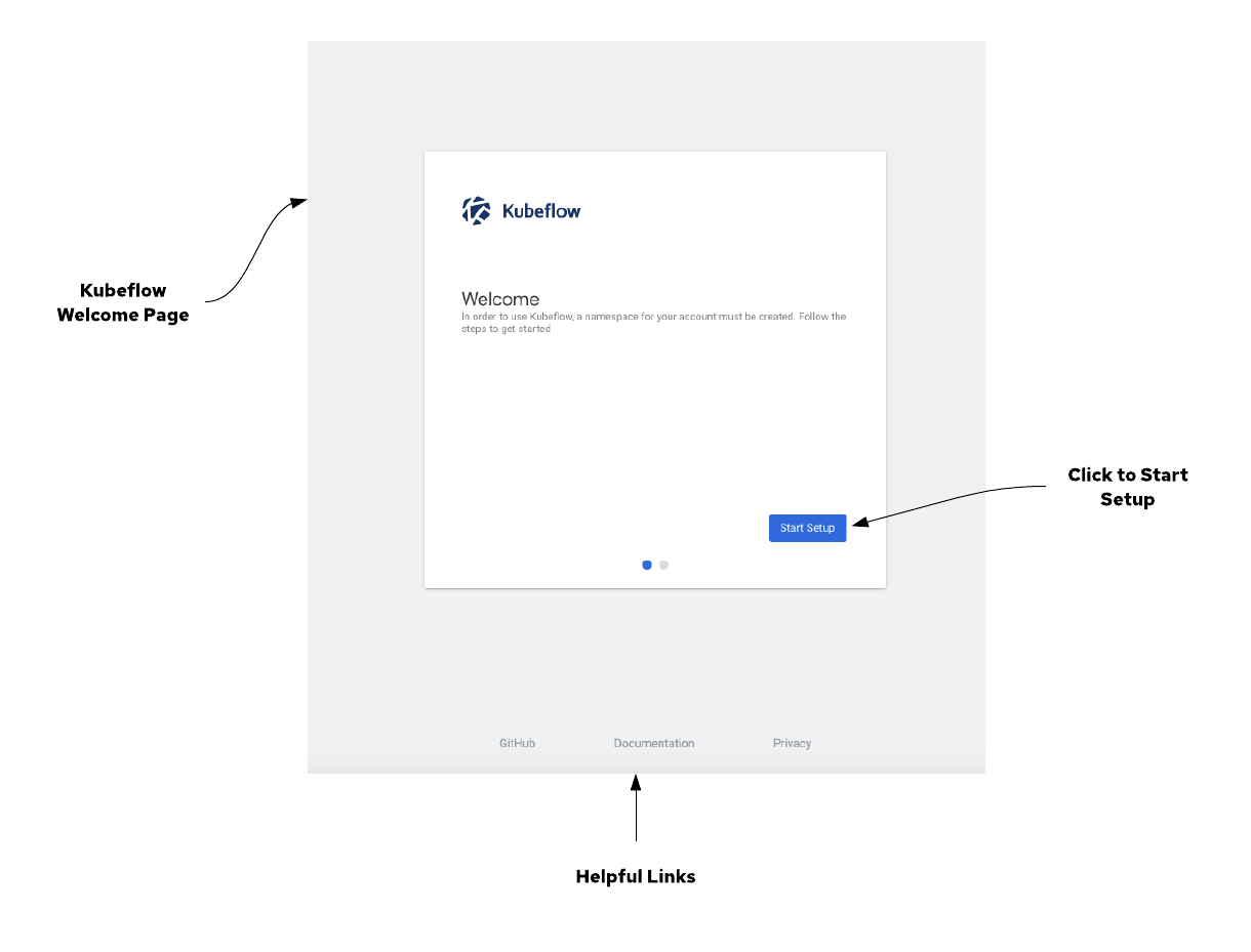 Start Setup 버튼을 클릭하면 아래와 같이 Namespace 명을 입력하는 화면이 나타난다. 해당 Namespace는 notebooks pods 등과 같은 kubeflow의 여러 컴포넌트들이 실행될 때 사용 될 Namespace가 된다.