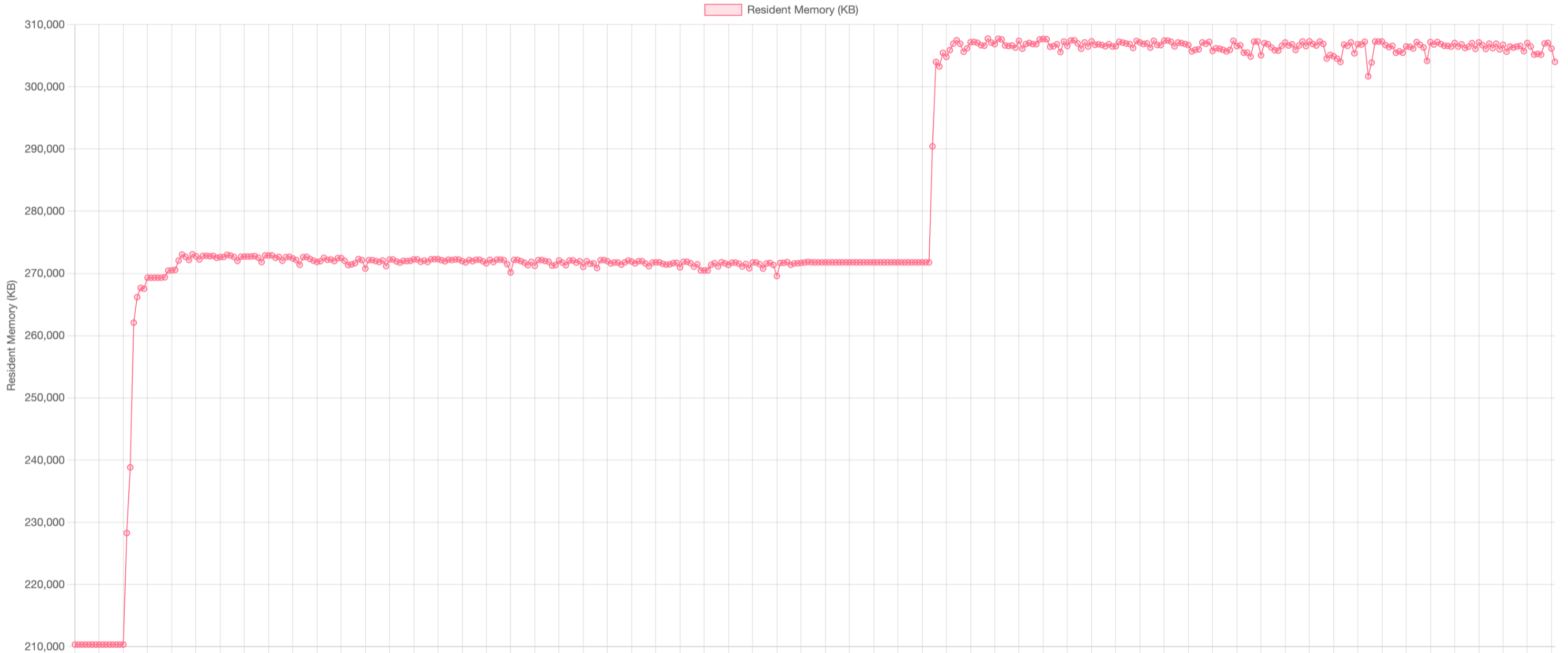 rss가 지속적으로 올라가다가 어느 순간부터 수렴하는 걸 확인할 수가 있다. 기존 malloc은 호출할 때마다 rss 메모리가 올라갔는데 tcmalloc의 경우는 일정 수준까지 올라가다가 수렴을 한다. 하지만 호출이 중단된 시점에서도 해당 메모리를 그대로 들고 있다.