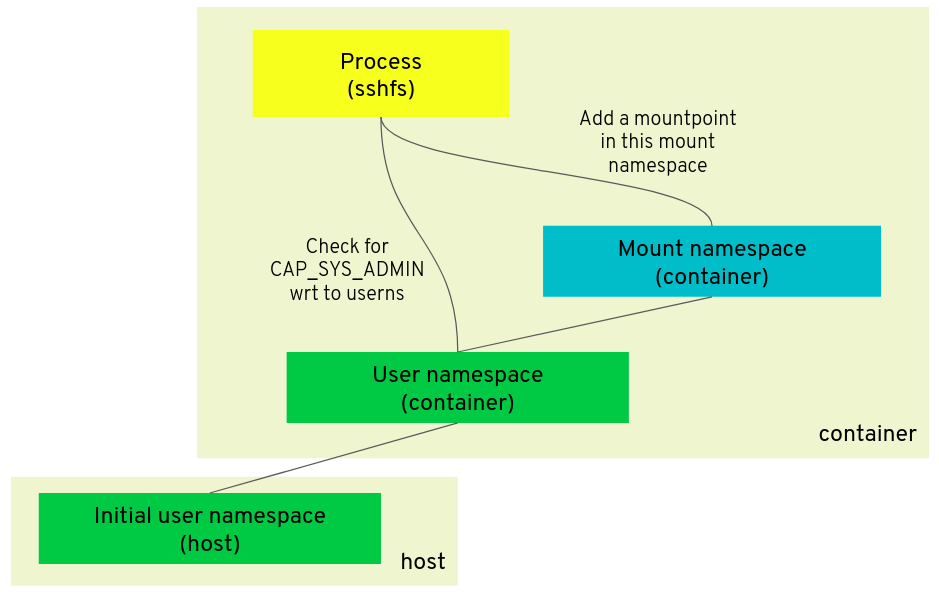 컨테이너가 새로운 user 네임스페이스 없이 설정될 때, "sshfs"를 성공적으로 실행할 수 있는 유일한 방법은 컨테이너에 CAP_SYS_ADMIN을 제공하는 것이다.
