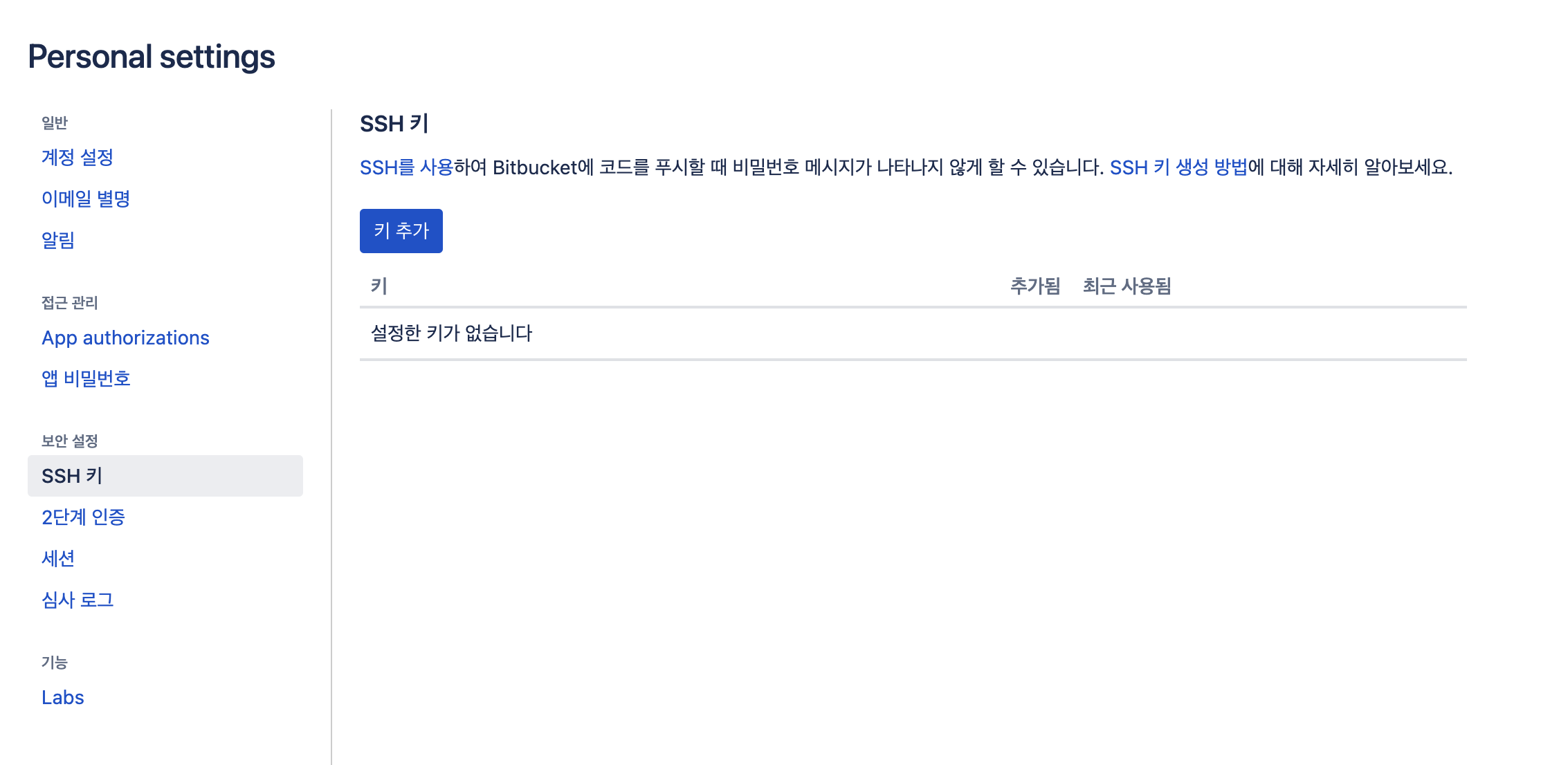 Personal Bitbucket settings를 클릭하면 사용자 설정 화면이 나타난다.